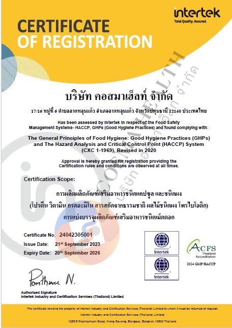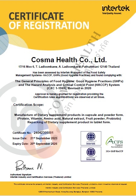 Cosma Health เราคือ บริษัทผลิตอาหารเสริม ที่มีโรงงานอยู่ในจังหวัด ปทุมธานี บริหารงานโดยทีมผู้เชี่ยวชาญที่คร่ำหวอดในวลการอาหารเสริมกว่า 10 ปี เราเริ่มจากการเป็นผู้นำเข้า และจัดจำหน่าย จนพัฒนามาเป็นผู้ผลิต พร้อมด้วยทีมผู้เชี่ยวชาญ R&D ที่วิจัย และพัฒนาสูตร ตลอดจนค้นคว้า นวัตกรรมเทคโนยีการผลิต และควบคุมคุณภาพที่ทันสมับ และได้มาตรฐานสากล
